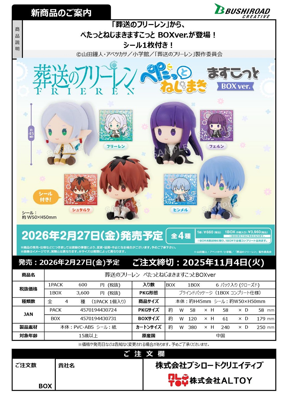 背中にねじがついたからくり人形のようなデフォルメデザインの「ぺたっとねじまきますこっと」『葬送のフリーレン』に、BOXver.が登場。