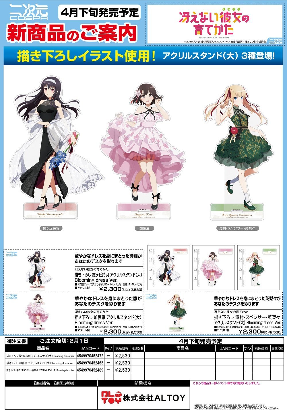 冴えない彼女の育てかた 描き下ろし アクリルスタンド(大)Blooming dress Ver.『霞ヶ丘詩羽』『加藤恵』『澤村・スペンサー・英梨々』【2026年4月下旬発売】[4549970452472]