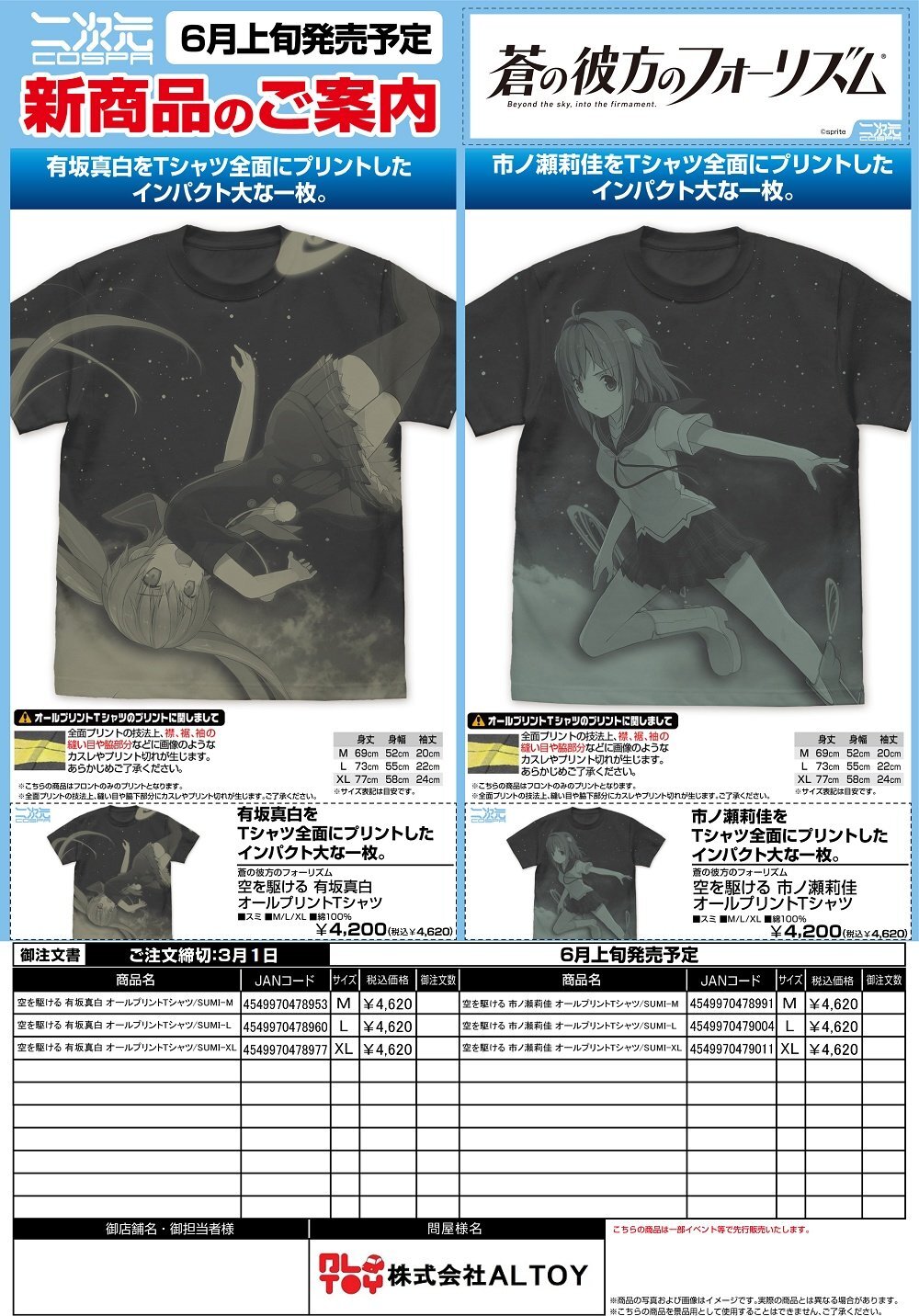 蒼の彼方のフォーリズム『空を駆ける 有坂真白 オールプリントTシャツ』『空を駆ける 市ノ瀬莉佳 オールプリントTシャツ』【2026年6月上旬発売】[4549970478953]