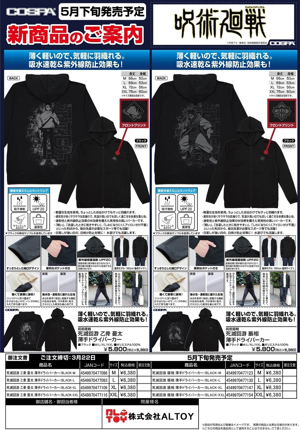 呪術廻戦『死滅回游 乙骨 憂太 薄手ドライパーカー』『死滅回游 脹相 薄手ドライパーカー』【2026年5月下旬発売】[4549970477086]