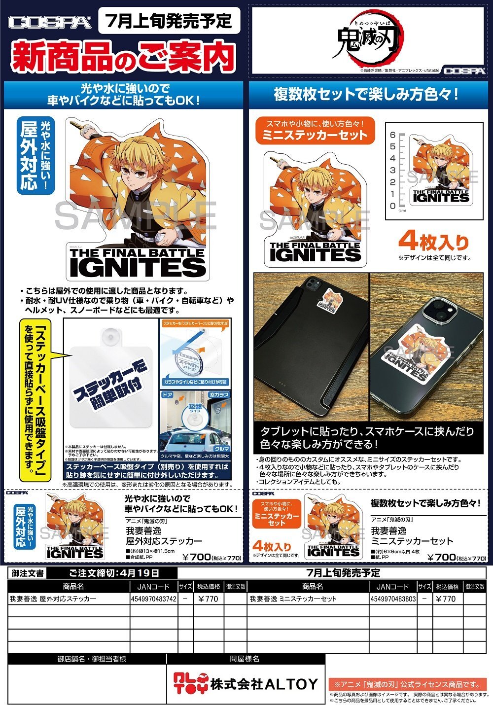 鬼滅の刃『我妻善逸 屋外対応ステッカー』『我妻善逸 ミニステッカーセット』【2026年7月上旬発売】[4549970483742]